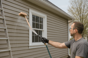 Spring cleaning removes winter's salt, dirt, and mold accumulation. Start from top, working downward to prevent streaking. Mix one cup of dish soap with four litres of warm water. Apply with soft brush, let sit five minutes, then rinse thoroughly. This simple cleaning prevents permanent staining and reveals any winter damage.
