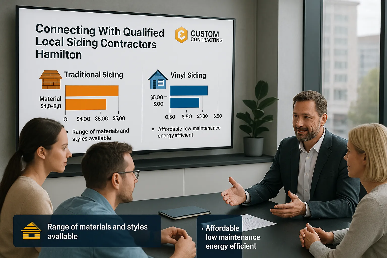 Securing accurate estimates may include requesting a breakdown in a tabular format to compare items such as material prices, labor costs, and additional services. The following table illustrates an example breakdown for various siding types in Hamilton: